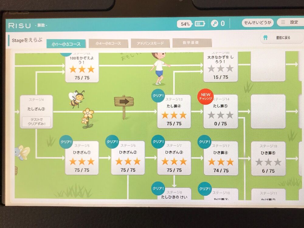 RISUの学習はステージ制になっており、実力テストの結果でスタートステージが決まります。