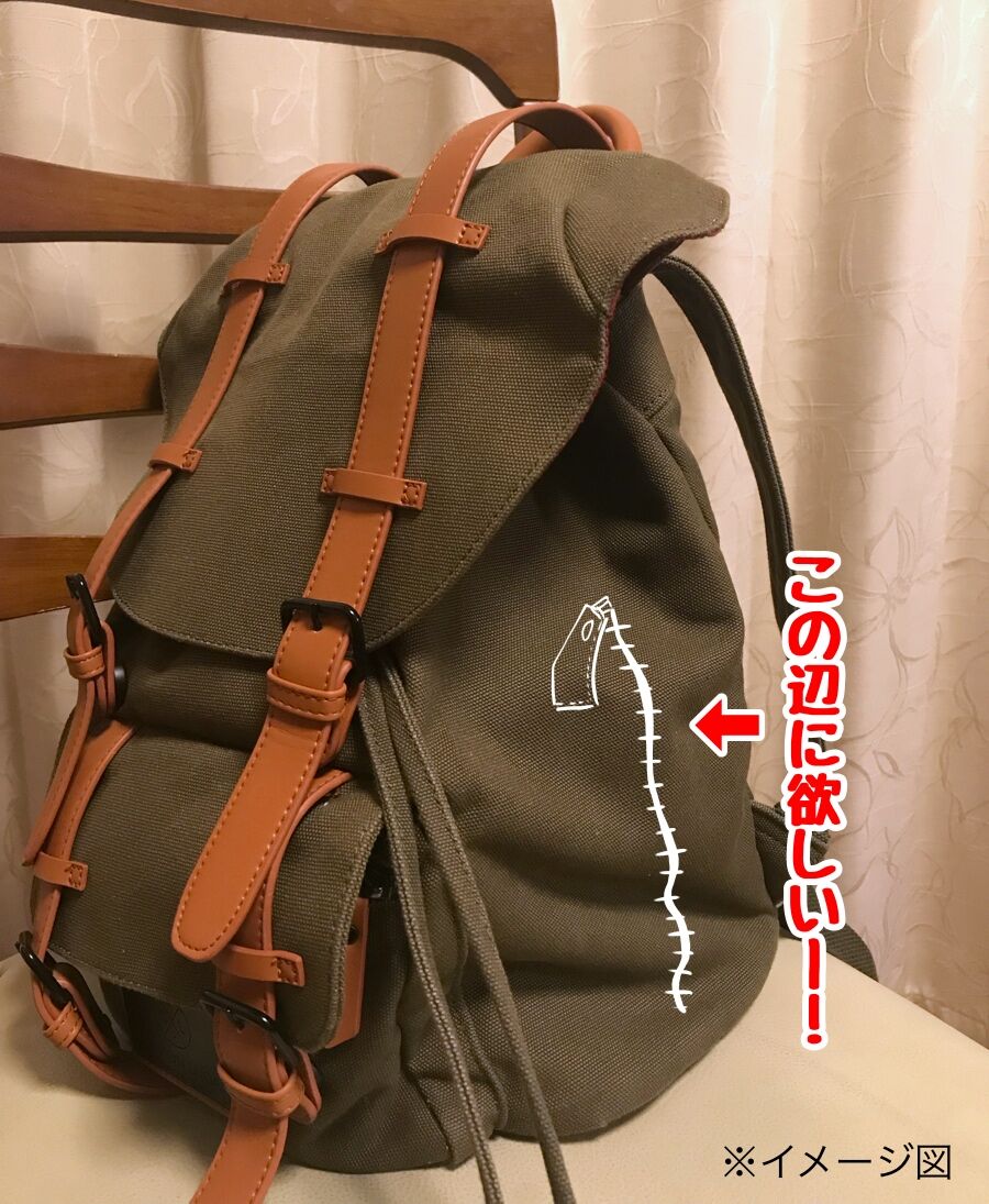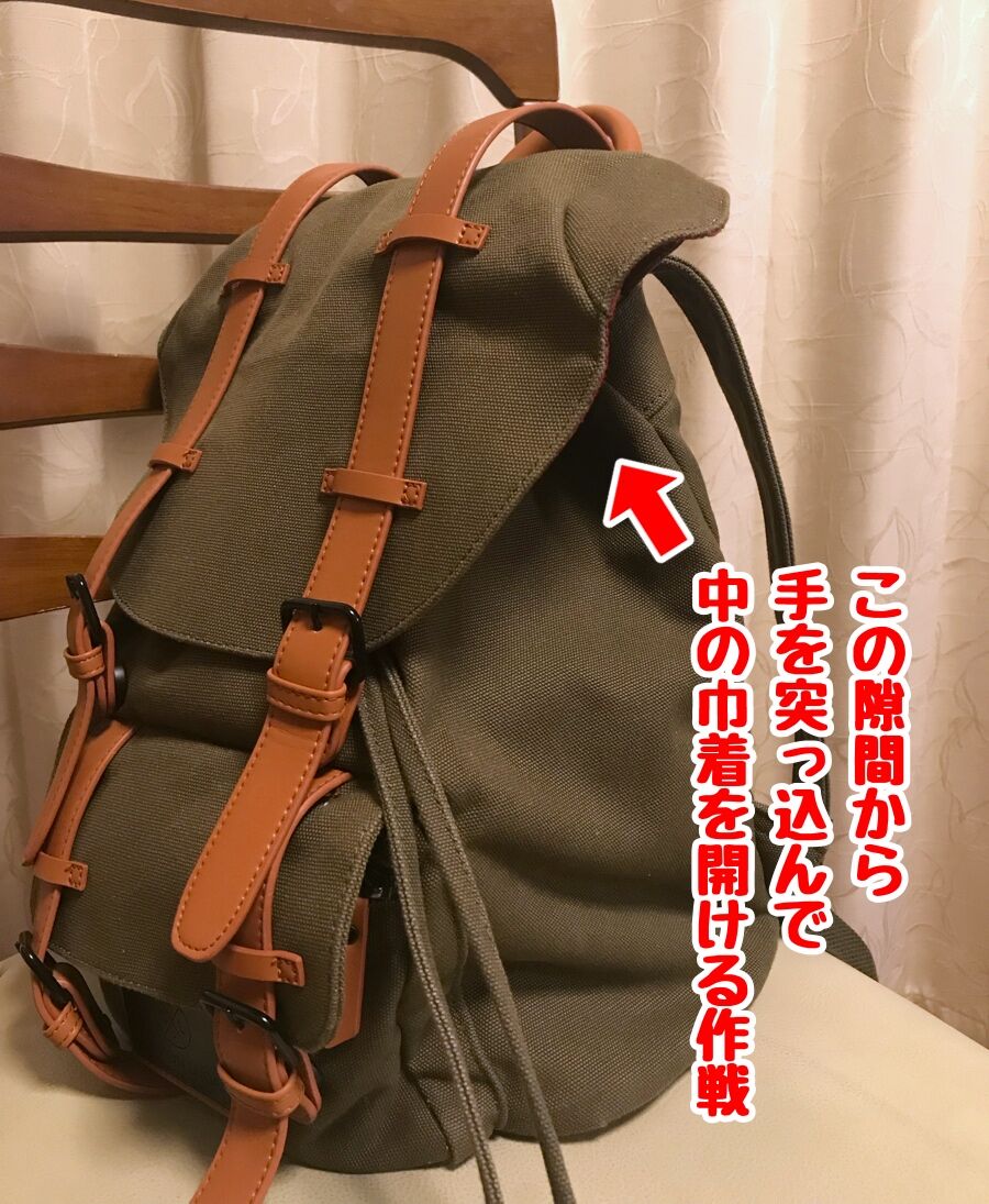 フラップを外さずに隙間に腕を突っ込み、ダイレクトに巾着を開いていました。