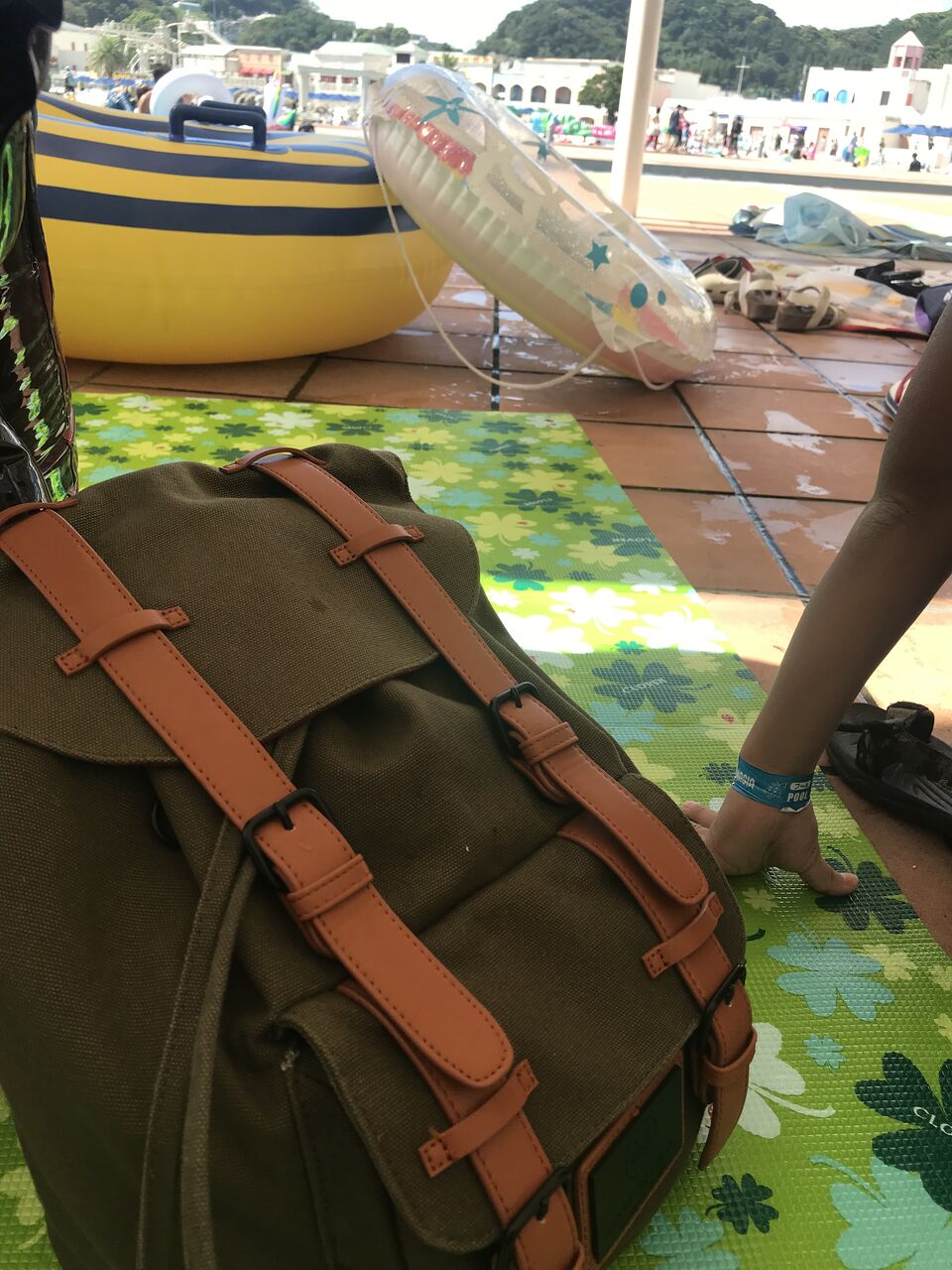また、プールに行った時には、濡れた水着の上から背負ったりして一部濡れてしまったのですが、中までは浸透せず荷物は無事でした。