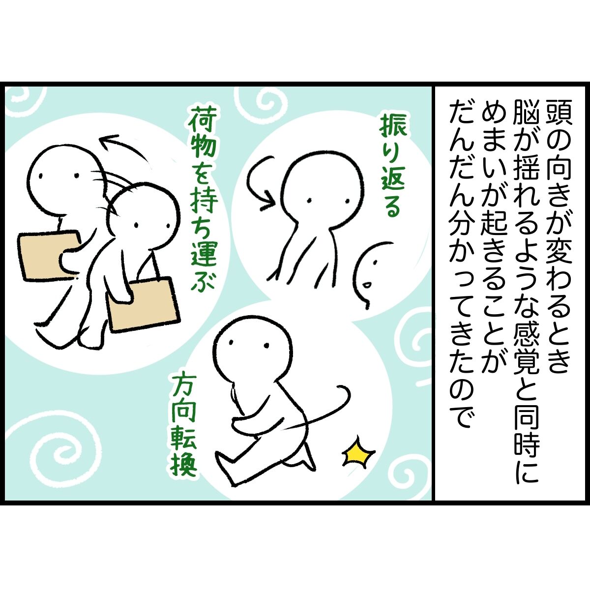 じっとしている時は何ともないのですが、動くとぐわんぐわんと大きく揺さぶられるようなめまいです。